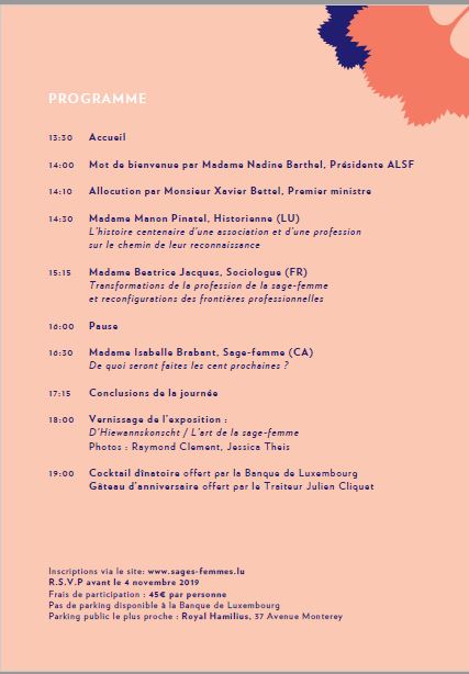L’Association Luxembourgeoise des Sages-femmes (ALSF) fête son centenaire sous le Haut Patronage de son Altesse Royale la Grande-Duchesse et sous le Patronage du Ministère de la Santé du Luxembourg.